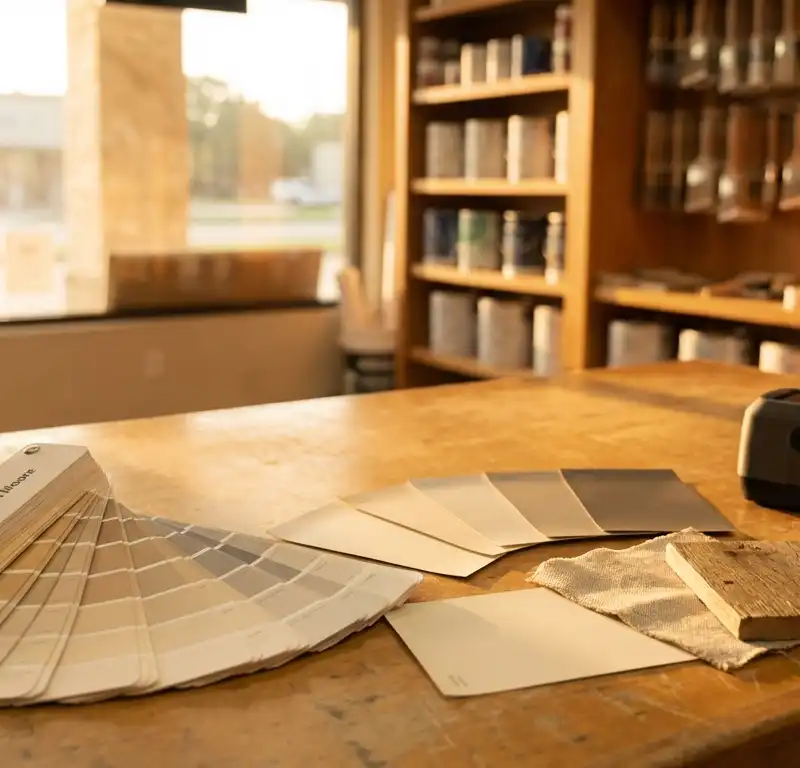 Colors shift in Houston's intense natural light. A white that reads clean in northern climates can look yellow here. Our staff knows which Benjamin Moore whites, grays, and neutrals perform in Texas sun angles and Houston's warm-toned interiors.